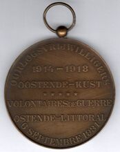 Op de keerzijde : rondom boven OORLOGSVRIJWILLIGERS, centraal horizontaal 1914-1918 / OOSTENDE-KUST / βββββ / VOLONTAIRES DE GUERRE / OSTENDE-LITTORAL, rondom onder 6 septembre 1931