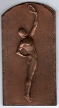 Op de voorzijde : links verticaal VOLONTE FORCE BEAUTE, rechts PAR LES SPORTS, centraal een sportieve man met in de linkerhand een lauwerkrans, linksonder gesigneerd C. DEVREESE