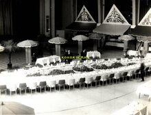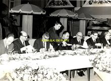 Formaat : 13 x 18 cm. - Aan tafel herkennen we, tweede van links, Rik Onckelinckx, vierde van links, premier Vanden Boeynants en zesde van links, vicepremier Willy Declercq. Paul Vanden Boeynants was premier en minister van wetenschapsbeleid. Willy Declercq was vicepremier en minister van begroting. De regering Vanden Boeynants I bestond uit een coalitie van christelijke PSC/CVP en liberale PVV/PLP partijen.