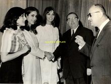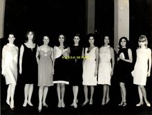 Formaat : 18 x 24 cm. - Drie schoonheidskoninginnen in het gezelschap van Roger De RamΓ©e (rechts), directeur van de Kursaal en John Lauwereins, waarnemend burgemeester