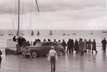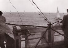 Formaat : 13 x 18 cm. - Deelnemers aan een zeilwedstrijd op zee. Toeschouwers op de dijk