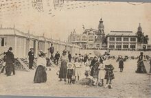 Ostende, les cabines de bain. - Op de achtergrond, de westgevel van het derde Kursaal. Links enkele luxe-badkarren en spelende kinderen op het Groot Strand