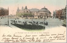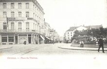 47. Ostende. - Place du ThéÒtre. - Links op de hoek met de Leopoldlaan "Banque et change" van Maurice Elleboudt. Rechtdoor de Weststraat (huidige Adolf Buylstraat) en rechts achter de bomen, de schouwburg (ThéÒtre Royal)