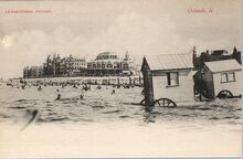 Le Bon, Γ©diteur, Ostende. - In de achtergrond de Zeedijk met het Derde Kursaal, vooraan badkarren in zee met toeristen die aan het zwemmen zijn