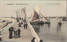 Le Bon, Γ©diteur, Ostende, NΒ° 51. - Ostende. - Promenade en mer. - Bijgekleurde kaart. - Links het Weststaketsel met in de havengeul enkele vissersvaartuigen. Rechts, het Ooststaketsel.