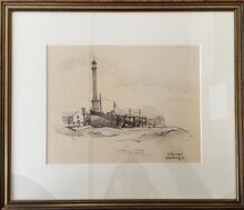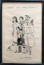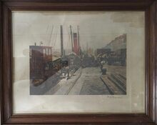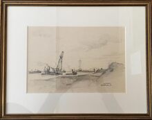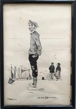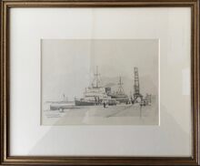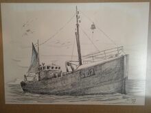 Vissersvaartuig O.700 Bisiti ligt in het Montgomerydok. Lucy Loes poseert op de kaai. In de achtergrond rechts zien we Lange Nelle op de Oosteroever
