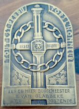 Op de keerzijde : links naast dee rand TOUT EST PERDU, rechts naast de rand FORS LβHONNEUR, centraal de bovenste helft van een geketend zwaard, op de pareerstang van het gevest links 1914, midden een leeuwenkop, rechts 1940, op de afsnede AAN DE HEER BURGEMEESTER / E. VAN GLABBEKE / TE OOSTENDE