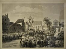 Litho : ArrivΓ©e du cortΓ¨ge funΓ¨bre Γ lβΓ©glise de Laeken 14/10/1850