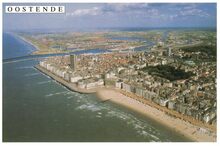 Tropic T 322. - Panorama van Oostende, zijn Groot Strand langs de Albert I-promenade vanaf de Kursaal tot aan de havengeul. we zien het centrum, een deel van de haven en op de achtergrond de Vuurtorenwijk en het strand tot Bredene