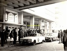 Formaat : 18 x 24 cm. - Controlepunt aan de hoofdingang van de Kursaal langs de Van Iseghemlaan. 100ste Rallye Monte-Carlo. Nr.77 : Tony Costello en Gerry Cooper in hun Rover 2000. Zij werden 62ste. Nr.78 : Georges Duviau en Ian Stevenson in hun Ford Cortina Lotus. Zij gaven op.