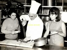 Formaat : 18 x 24 cm. - Meesterkok Richard Parmentier heeft een demonstratie aan Paulette De Keyser, hostess van de Kursaal (links) en Brigitte, telefoniste van de Kursaal