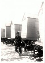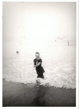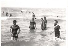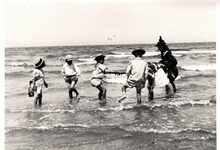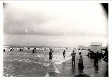 Formaat : 17,5 x 12,5 cm. - De badmode tijdens de Belle Epoque. Op de achtergrond, de traditionele badkarren