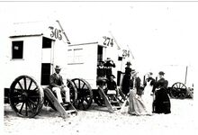 Formaat : 12,5 x 17,5 cm. - Een familie poseert nabij de badkarren in de Belle Epoque. Men genoot in zondagse kledij van het strandleven. Ook de dienstmeid of kinderjuffrouw (tweede van rechts) is mee.