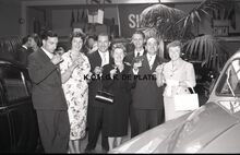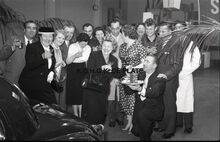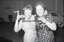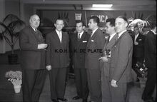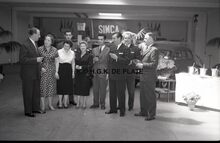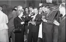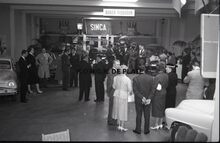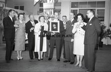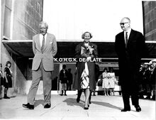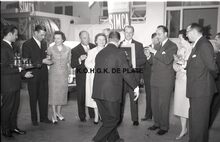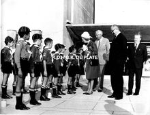 Formaat : 18 x 24 cm. - Tentoonstelling met beeldhouwwerken van Koningin Elisabeth in de Montrosezaal van 14 tot 22/08/1965 ten voordele van Oxfam. Zij wordt begroet door een ere-haag van Oostendse scouts (links) en sea-scouts (rechts). Zij is in het gezelschap van haar echtgenoot en Roger De RamΓ©e (rechts), directeur van de Kursaal.