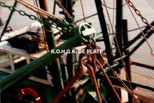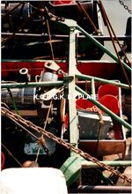 Formaat : 15 x 10 cm. - Stalen boomkorvisser O.100 "Emilie" met Baudoin motor gebouwd voor reder Constant Wynsberghe met verschillende technologische middelen. Detail van het schip