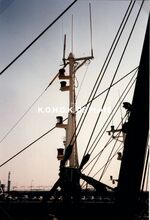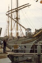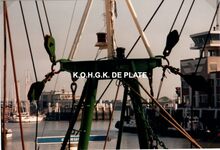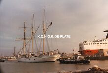 Het schip vaart voorbij het RNSYC. In de achtergrond de Visserskaai met links de Peperbusse