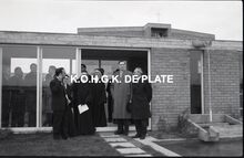 Negatief : 6 x 9 cm. - Op 11 april werd het nieuwe klooster aan de pers voorgesteld. Gebouwd naar de plannen van ir. architect Paul Felix, terwijl Michel Martens met glasramen en Roger Bonduel met sculptuur hebben meegewerkt. Tweede van rechts, burgemeester Jan Piers