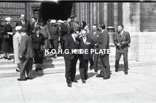 Negatief : 6 x 9 cm. - Plaatsen van de herdenkingssteen van het nieuw stadhuis. Rechts, burgemeester Adolf Van Glabbeke.
