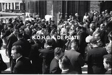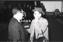 Negatief : 6 x 9 cm. - 's Morgens was er in de Sint Petrus en Pauluskerk een eucharistieviering voor de overleden familie- en personeelsleden. Na de plechtigheid, burgemeester Adolf Van Glabbeke in gesprek met Jacques Bonnevie, afgevaardigde-beheerder van de firma Valcke.