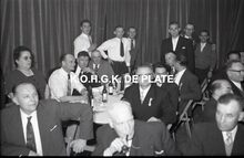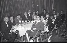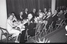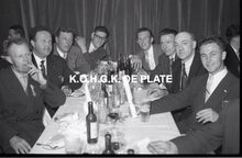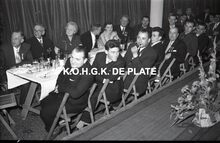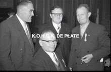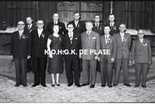 Negatief : 6 x 9 cm. - Achteraan, in het midden, Jacques Bonnevie, afgevaardigde-beheerder, in gezelschap van gedecoreerde personeelsleden.