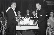 Negatief : 6 x 9 cm. - 's Morgens was er in de Sint Petrus en Pauluskerk een eucharistieviering voor de overleden familie- en personeelsleden. Na de plechtigheid, burgmeester Adolf Van Glabbeke in gesprek met Jacques Bonnevie, afgevaardigde-beheerder van de firma Valcke