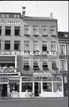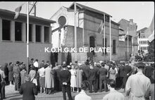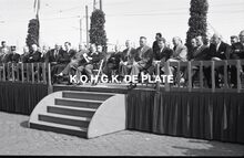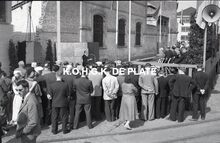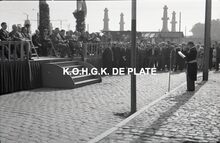 Negatief : 6 x 9 cm. - De tribune met de genodigden bij het plaatsen van de herdenkingssteen van het nieuw slachthuis.