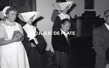 Negatief : 6 x 9 cm. - Religieuze plechtigheid in de kapel. Op de rug gezien, zusters van de Dochters der Liefde (van Vincentius Γ Paulo).