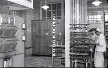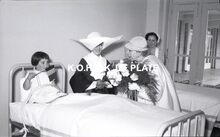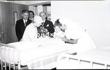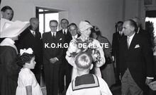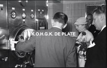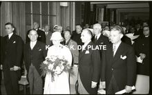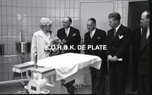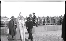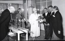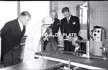 Negatief : 6 x 9 cm. - Koningin Elisabeth, met rechts, Edmond Leburton, minister van volksgezondheid en gezin en Eduard Delcroix. Links, de provinciegouverneur Pierre van Outryve d'Ydewalle en Adolf Van Glabbeke, minister van openbare werken en wederopbouw. Op de tweede rij links, Maurice Quaghebeur sr., waarnemend burgemeester