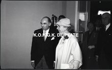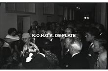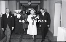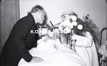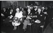 Negatief : 6 x 9 cm. - Mevrouw Van Glabbeke krijgt bloemen bij haar aankomst.
