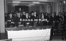 Negatief : 6 x 9 cm. - Edouard Delcroix houdt zijn toespraak. Rechts, Edmond Leburton, minister van volksgezondheid en gezin. De koningin en naast haar, Adolf Van Glabbeke, minister van openbare werken en wederopbouw.