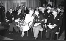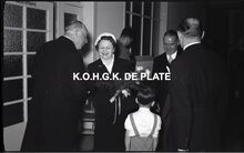 Negatief : 6 x 9 cm. - Edouard Delcroix in gesprek met koningin Elisabeth. Naast hem, Edmond Leburton, minister van volksgezondheid en gezin en Adolf Van Glabbeke, minister van openbare werken en wederopbouw