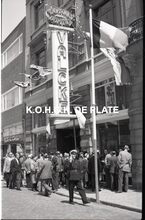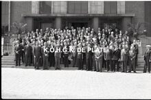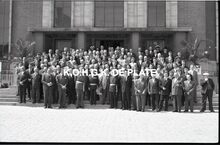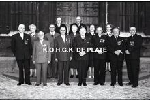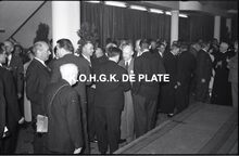 Negatief : 6 x 9 cm. - Plechtige ontvangst door het stadsbestuur van de raad van bestuur, de familie en het personeel van de firma Valcke. Het gerechtshof was toen dienstdoend stadhuis.