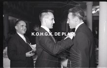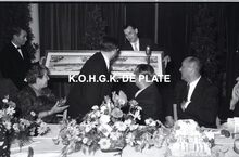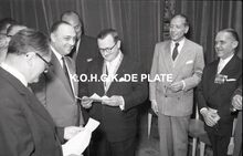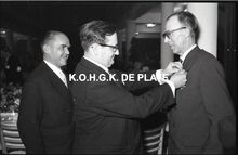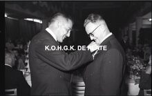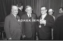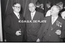 Negatief : 6 x 9 cm. - Een personeelslid krijgt van Jacques Bonnevie, afgevaardigde-beheerder,Β een ereteken. Burgemeesster Adolf Van Glabbeke kijkt blij toe.