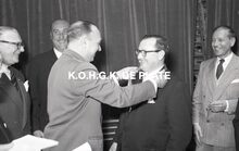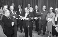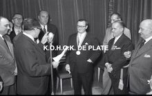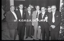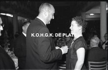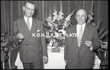 Negatief : 6 x 9 cm. - Middaguur. Receptie voor de stadsnotabelen, de klanten en de leveranciers van de firma. Rechts, Jacques Bonnevie, afgevaardigde-beheerder, en naast hem burgemeester Adolf Van Glabbeke en zijn echtgenote.