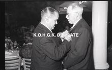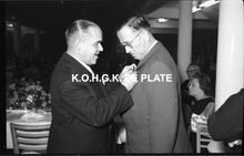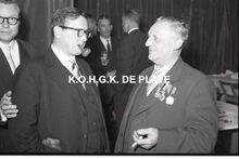 Negatief : 6 x 9 cm. - Maurice PrinzieΒ krijgt een ereteken. Tussen hen, burgemeester Adolf Van Glabbeke.