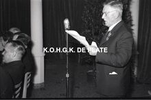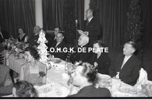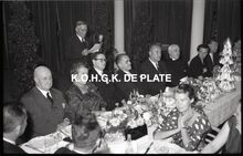 Negatief : 6 x 9 cm. - Middaguur. De receptie voor de stadsnotabelen, de klanten en de leveranciers van de firma. Jacques Bonnevie, afgevaardigde-beheerder van de firma, heeft het woord. We herkennen van rechts naar links, Bertha Tratsaert, gemeenteraadslid, mevrouw Van Glabbeke, de heer Fernand Bonnevie, beheerder en burgemeester Adolf Van Glabbeke.