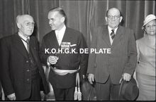 Negatief : 6 x 9 cm. - Van links naar rechts, Fernand Bonnevie, beheerder, Adolphe van Elslande, gepensioneerd directeur met meer dan 50 jaar dienst, en Jacques Bonnevie, afgevaardigde-beheerder. Rechts, mevrouw Van Glabbeke.