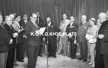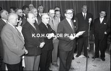 Negatief : 6 x 9 cm. - Jacques Bonnevie werd ere-burger van de Kapellestraat. Rechts, Fernand Bonnevie, beheerder en naast hem, burgemeester Adolf Van Glabbeke. Links, naast Jacques Bonnevie, Paul Valcke, voorzitter van de beheerraad. Links, Theo Dehaene.Β