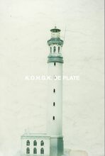 Formaat : 15 x 10 cm. - De derde vuurtoren werd in 1926 in gebruik genomen en door de Duitsers bij hun aftocht in 1944 neegehaald. Zijn hoogte was 62 meter. De rode en witte banden waren er in 1938 bijgeschilderd.