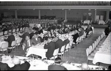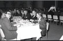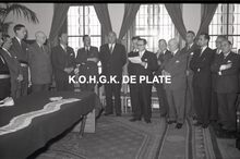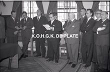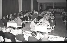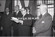 Negatief : 6 x 9 cm. - Plechtige ontvangst door het stadsbestuur van de raad van bestuur, de familie en het personeel van de firma Valcke. Het gerechtshof was toen dienstdoend stadhuis. Jacques Bonnevie, afgevaardigde-beheerder, houdt zijn toespraak. Naast hem, rechts, Fernand Bonnevie, beheerder. Tussen hen, Adolphe van Elslande, gepensioneerd directeur met meer dan 50 jaar dienst. We herkennen schepen Jan Piers en naast hem de stadssecretaris, Michel Surmont.