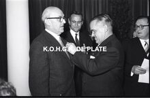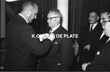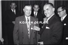 Negatief : 6 x 9 cm. - Een gedecoreerd personeelslid in het gezelschap van burgemeester Adolf Van Glabbeke. Rechts, Jacques Bonnevie, afgevaardigde-beheerder.