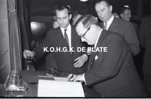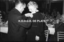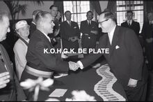 Negatief : 6 x 9 cm. - Plechtige ontvangst door het stadsbestuur van de raad van bestuur, de familie en het personeel van de firma Valcke. Burgemeester Adolf Van Glabbeke wenst de heer Jacques Bonnevie, afgevaardigde-beheerder van de firma Valcke, geluk. Hij ontving ook deΒ ere-medailleΒ van de stad Oostende.
