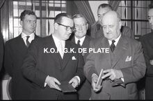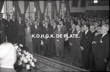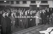 Negatief : 6 x 9 cm. - Plechtige ontvangst door het stadsbestuur van de raad van bestuur, de familie en het personeel van de firma Valcke. Het gerechtshof was toen dienstdoend stadhuis. Vooraan links, Jacques Bonnevie, afgevaardigde-beheerder en naast hem Fernand Bonnevie, beheerder. Tussen hen, Adolphe van Elslande, gepensioneerd directeur van de firma met mee dan 50 jaar dienst