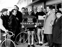 Formaat : 18 x 24 cm. - Rik Van Looy en Ward Sels na de aankomst van de rit Namen - Oostende, gewonnen door Ward Sels. Links, een blijde Fred De Bruyne,Β televisiereporter. Achter hem, burgemeester Jan Piers en naast hem, gemeenteraadslid Marcel Friederichs. Tussen beide renners, Roger De RamΓ©e, directeur van de Kursaal