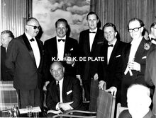 Formaat : 18 x 24 cm. - We herkennen o.a., zittend, schepen Kamiel Dehouck. Links, Roger De RamΓ©e, directeur van de Kursaal en in het midden, burgemeester Jan Piers.