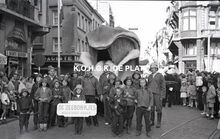 Negatief : 6 x 9 cm. - De folkloristische vereniging "De Zeebonkjes" uit Nieuwpoort-Bad met hun walvis op het Marie-Joséplein nabij de Adolf Buylstraat.