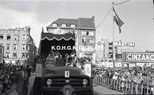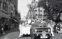 Negatief : 6 x 9 cm. - Stoet naar een ontwerp van kunstschilder Emile Bulcke. Praalwagen op een Ford vrachtauto van de Garage Fernand Stoops op het Marie-Joséplein.