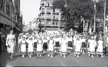 Negatief : 6 x 9 cm. - Een groep meisjes in volkskledij op het Marie-Joséplein. De stoet kwam uit de Adolf Buylstraat.