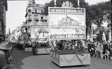 Negatief : 6 x 9 cm. - Stoet naar een ontwerp van kunstschilder Emile Bulcke. Praalwagen nummer 12 op het Marie-Joséplein nabij het hotel "Du Parc".