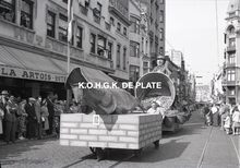 Negatief : 6 x 9 cm. - Stoet naar een ontwerp van kunstschilder Emile Bulcke. Praalwagen nummer 10 "Aquarium" op het Wapenplein.